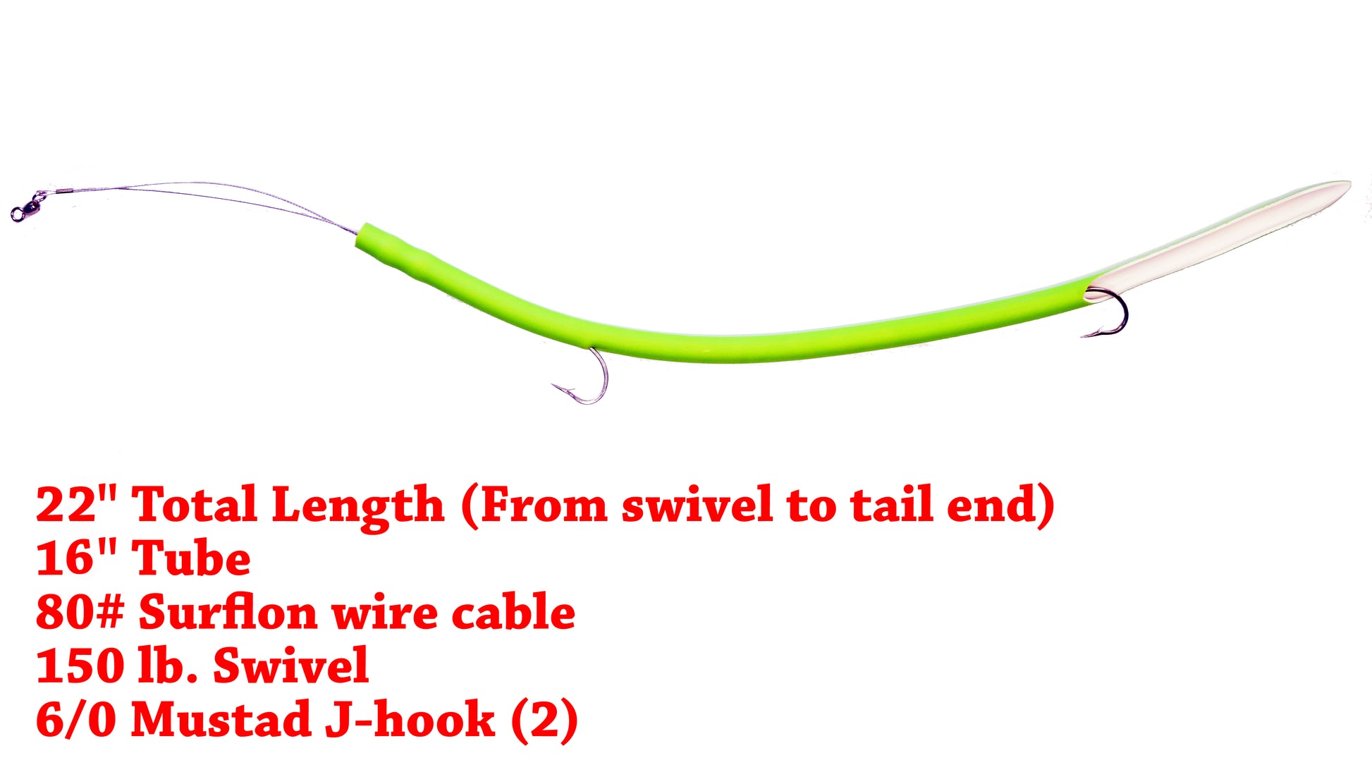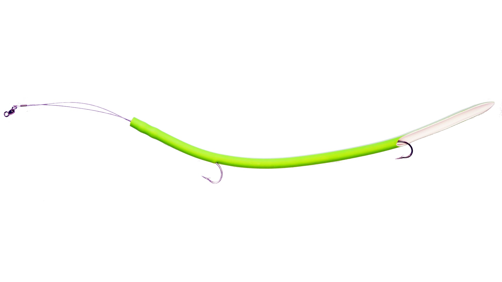 GREEN CLASSIC CUDA TUBES (DOUBLE) J-HOOK. 22" total length, 7/16" diameter 16" long tube, 80 lb coated wire, and DUAL 6/0 J-hook. Perfect for use with a Medium to Medium-Heavy weight rod for plenty of rod bending action. Mustad Duratin J-hooks (2).