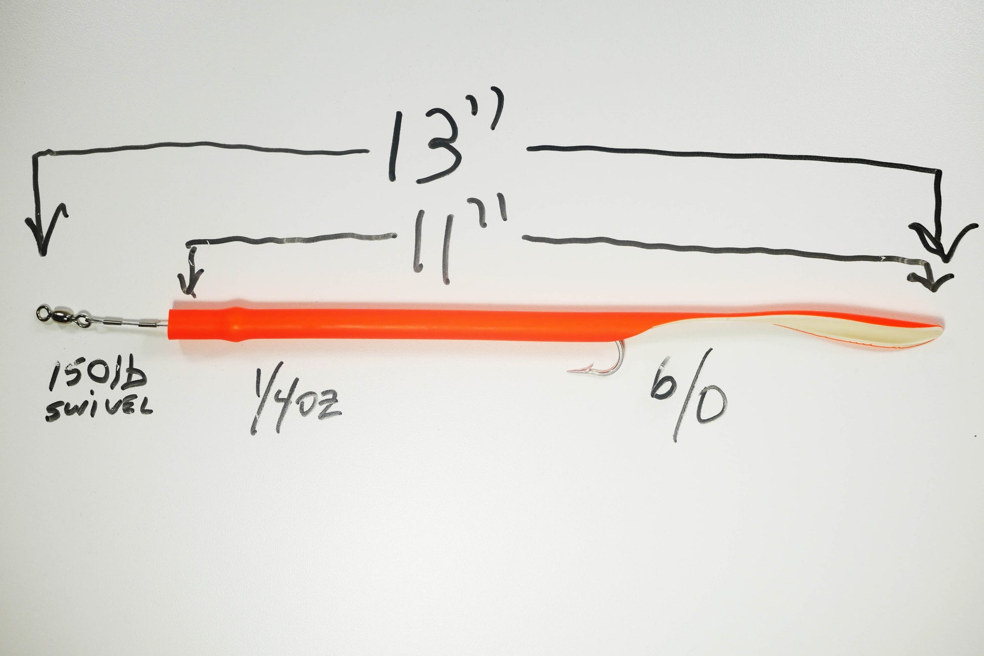 Pro Tips: Keep them curled up when not in use as the action comes from the tube being curved. Scale up leader size to 30-40+ lbs as the initial bite can be pretty violent. Also lighten your drag to soften the impact. Vary retrieve from as fast as you can reel to about 3/4 speed. In deeper water, let the lure sink a bit before retrieve.